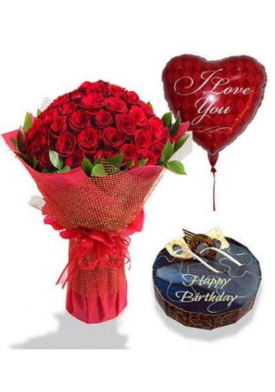 birthday flowers cake balloons30 red roses, birthday chocolate cake & balloon |