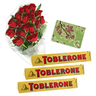 24 Roses Bouquet + 3 TobleroneSend 24 Red Roses Bouquet, 3 Toblerone 100 gms each with a Free Greeting Card with your message. |