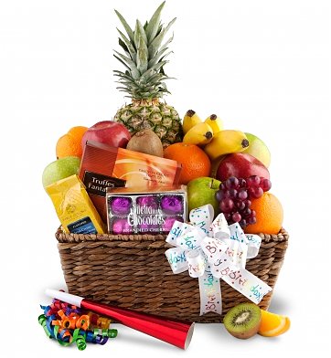 Happy Father's day Fruit BasketDecorated for the occasion, this fun basket is loaded with the finest available local and tropical fruits such as oranges, apples, bananas, pears, and grapes. Delicious treats like chocolates, crackers, cheese, and more round out this festive assortment. Ribbon, party horns, and other flourishes decorate the basket, as available. fruits ( 5 items). Exact basket and included products may vary by season and delivery location. |