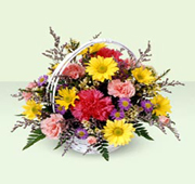 This sweet arrangement of yellow daisies, pink mini carnations, and hot pink carnations is complemented by purple monte casino and white waxflower. Designed in a handled basket, it's sure to send your special greetings with style.