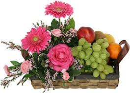 Description: Gerbera with carnation and rose 6 pcs pink comes with assorted fresh fruit including apples, oranges and grapes,pears, banana,mango in a basket With Flower Arrangement (6 items fruits)