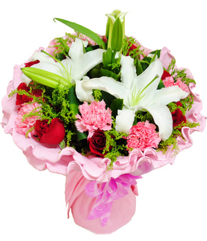 A Smile DayNine stems red roses with nine stems pink carnations and one white perfume lily mixed bouquet, send the deepest blessings to she, wish her have a good mood every day. Pink paper round style flowers. |