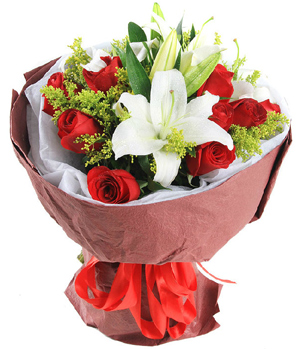 Feeling For YouMixed 11 red roses and 2 stalks white perfume lilies, with solidago. Crepe paper wrapped bouquet for love and more. |