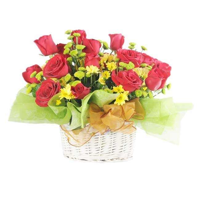 24 Red Roses and filler in basket Bunch of Roses make up this basket of blooms, an ideal gift for any occasion with its cheerful appearance.